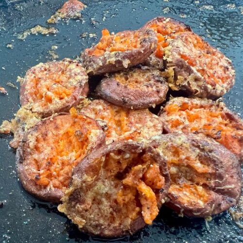 - Use 1/2-inch slices. Thinner slices will cook too quickly and can burn, especially on a preheated cast iron skillet.If using a preheated cast iron skillet, start checking around 18 to 20 minutes. The bottoms brown faster due to direct heat and the natural sugars in sweet potatoes.If using a standard sheet pan with parchment, plan for about 25 minutes of roasting time.Do not overcrowd the pan. Give the rounds space so they roast and crisp instead of steaming.Smash after roasting, not before. This helps them hold together and creates surface texture for the butter and toppings to settle into.You are not mashing them completely. Just press enough to create grooves and edges.Use a light hand with salt if adding cheese. Parmesan, feta, and blue cheese all bring additional saltiness.Broil with the oven rack in the middle position, not directly under the broiler, to prevent burning.Watch closely under the broiler. They can go from perfectly crisp to overdone very quickly.Balsamic glaze should be added after broiling, not before, so it stays thick and glossy.