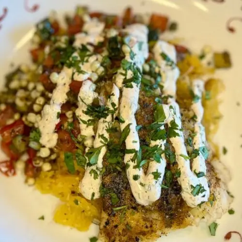 - Start with a base of seasoned spaghetti squash.Add a generous scoop of buttery corn, zucchini, bell pepper, jalapeño, and shallot mix.Top with a piece of seared cod.Drizzle with cilantro sour cream sauce.Garnish with more fresh cilantro or a wedge of lime, if desired.